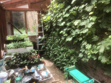 Both the big vine and the 6 tomato plants are ridiculously vigorous – probably 100 bunches of juicy grapes. The new vine has struggled in its second year – possibly because of root competition with its greedy neighbours. On the big worktop we have a bumper crop of basil in various boxes – it will be ready to harvest for making pesto next month. We also have the very important seedlings for next year's broccoli crop – they will be ready to plant out under netting in 2 or 3 weeks time. Remember we still have 20 bags of frozen broccoli from March this year!